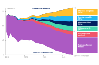 Los NDC chilenos adelantan el peak de emisiones del país hasta 2025 y reducen las emisiones anuales a 95Mt CO2eq para 2030. El plan para lograr la neutralidad del carbono en 2050 también incluye el cierre gradual de diez de las 28 centrales eléctricas de carbón para 2024 y la promoción de las energías renovables y los vehículos eléctricos. La reforestación con árboles nativos y la reducción de las emisiones por deforestación también forman parte de los NDC chilenos. Se supone que la economía del "hidrógeno verde" contribuye en un 21% a la mitigación.