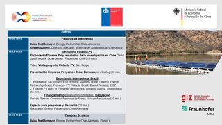 Para impulsar esta technología emergente, la GIZ Chile y el Fraunhofer Chile en el marco de la Energy Partnership Chile Alemania organizaron un webinario en el que se habló de los sistemas de plantas solares flotantes como una oportunidad para Chile. El webinario introdujo el tema a través de experiencias internacionales, requisitos, posibilidades de financiamiento y marcos regulatorios ejemplificando la posibilidad de aprovechar el sistema de la generación de energía en bases flotantes también para Chile.