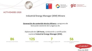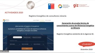 Javier Hueichapán, technical advisor of the project "Energy Efficiency in Mining" of the GIZ's 4e programme, referred to activities related to the future learning network for energy efficiency and emissions reduction. He indicated that they were working on adding additional content to the Industrial Energy Manager (IEM) diploma, in order to generate a Mining version. This Diploma already has 125 qualified energy managers after seven versions have been taught in three regions of the country. "From December this year, a web platform for Energy Efficiency in Mining will be available with technical information about energy efficiency measures and implemented projects, to inform and generate replicability in the sector. The project, which began in 2019 and will last until 2022, includes tailor-made technical support tools for small, medium and large mining companies, so that they can develop energy efficiency projects," Hueichapán said.